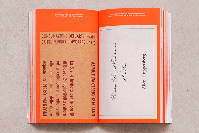 The selection in this volume makes visible how this kind of communication – often conceived by the artists themselves – superimposes the purely informative value of the printed matter with the freedom of artistic expression; evidence of a holistic practice where such cards can become artworks in their own right.